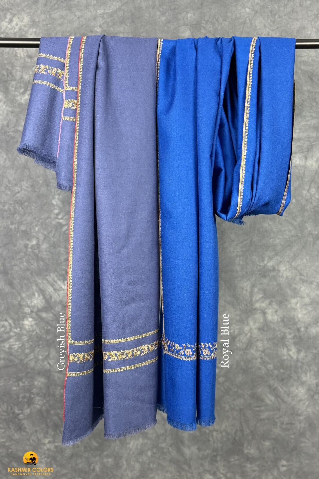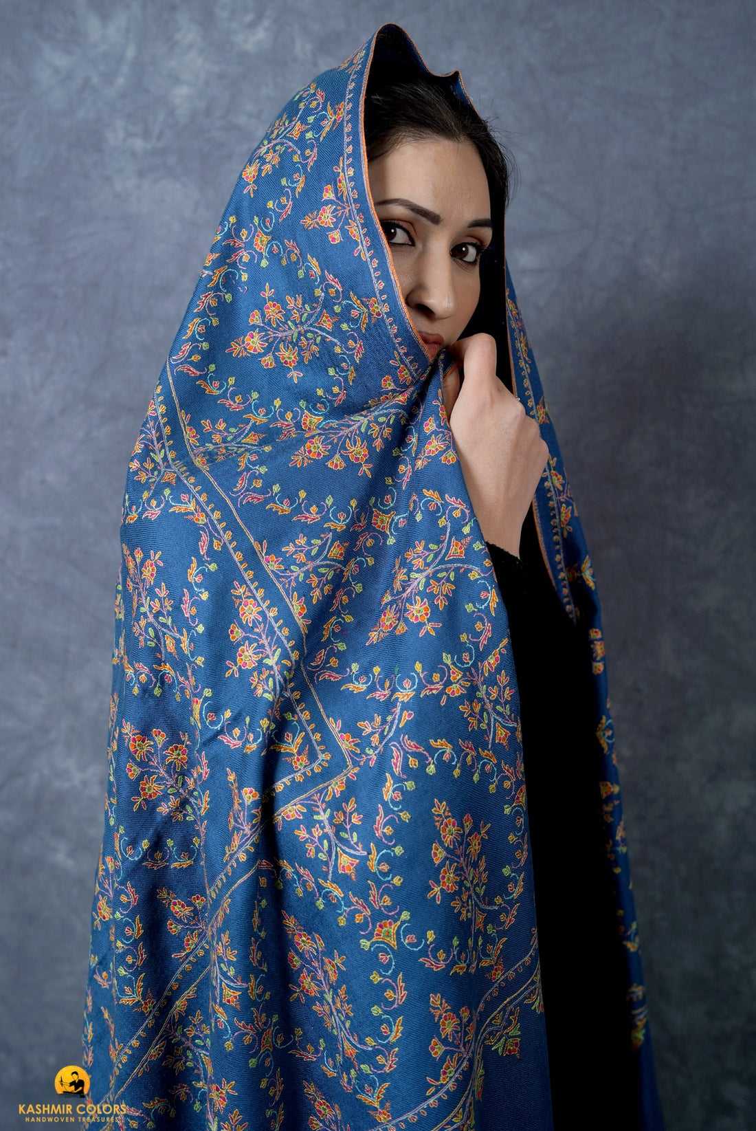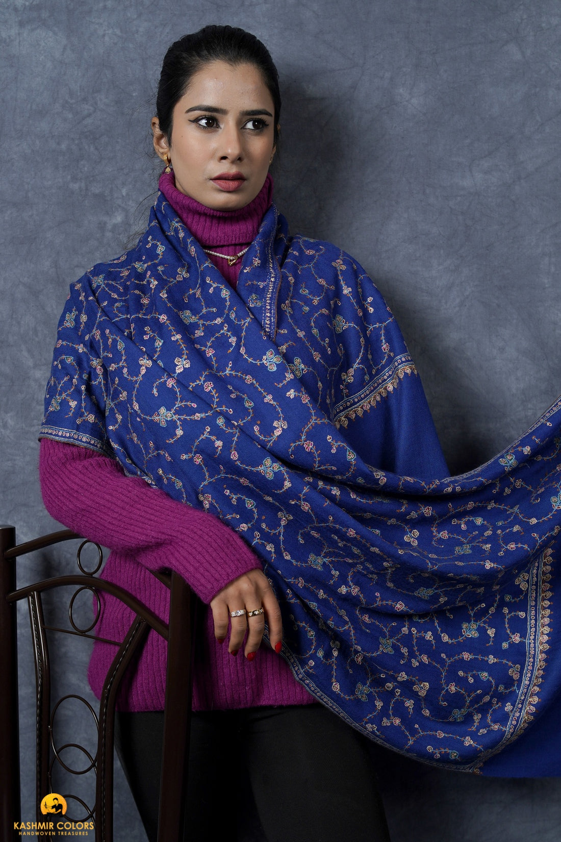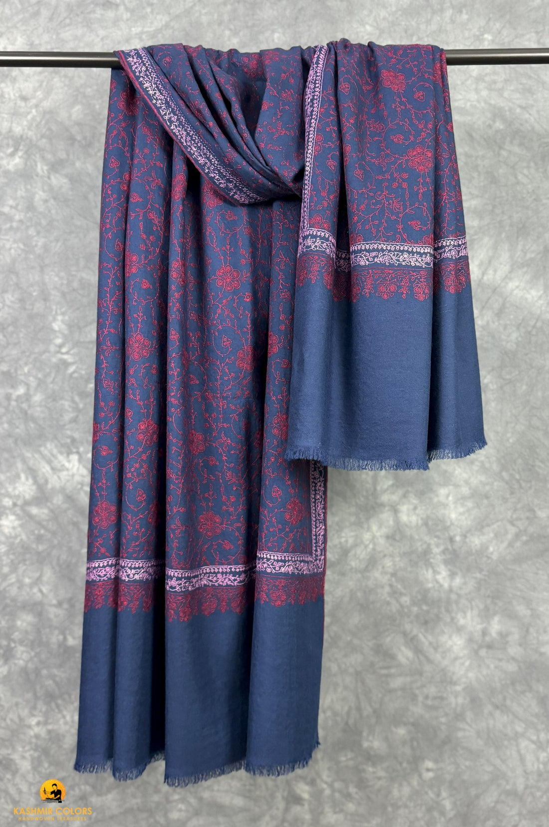 Jaaldar Blue with Red and Pink Hand Embroidered Cashmere Shawl