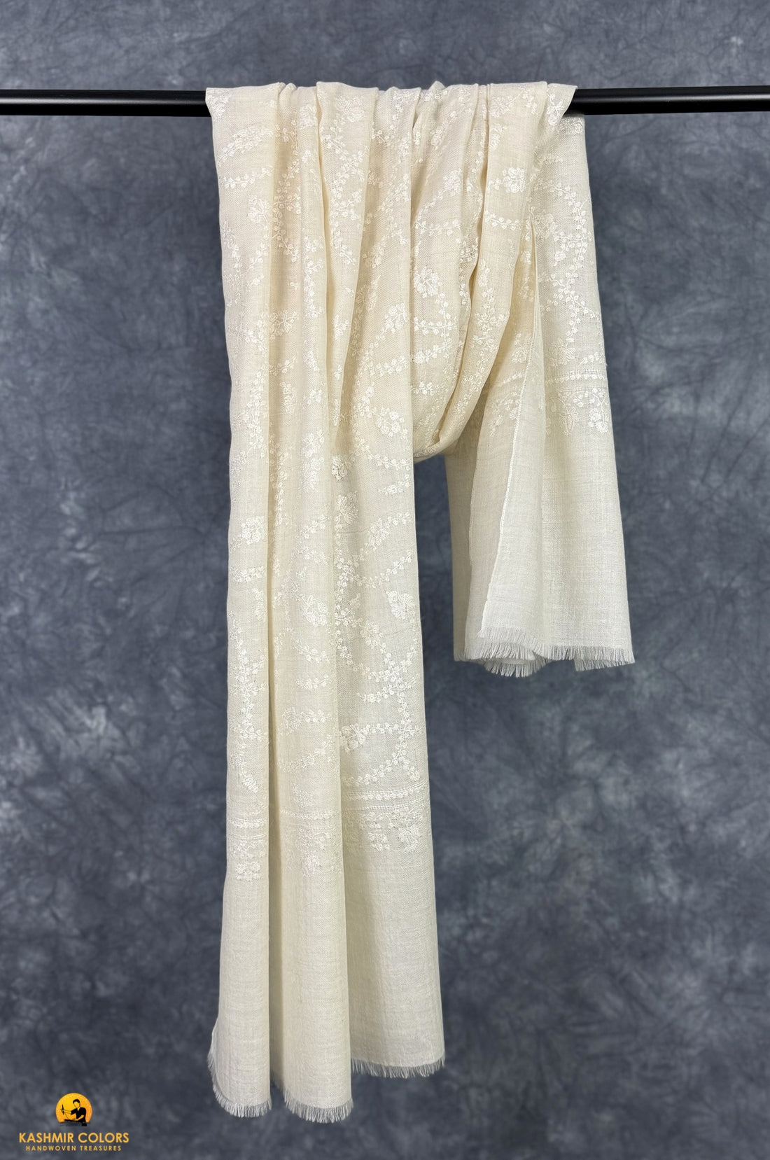Sozni Jaaldar Hand Embroidered Pashmina Shawl Natural White