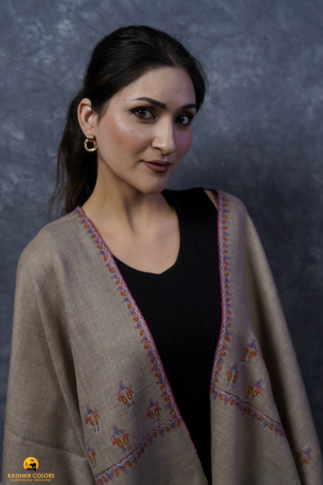 Natural Grey Outline Jamavar Hand Embroidered Pashmina Stole