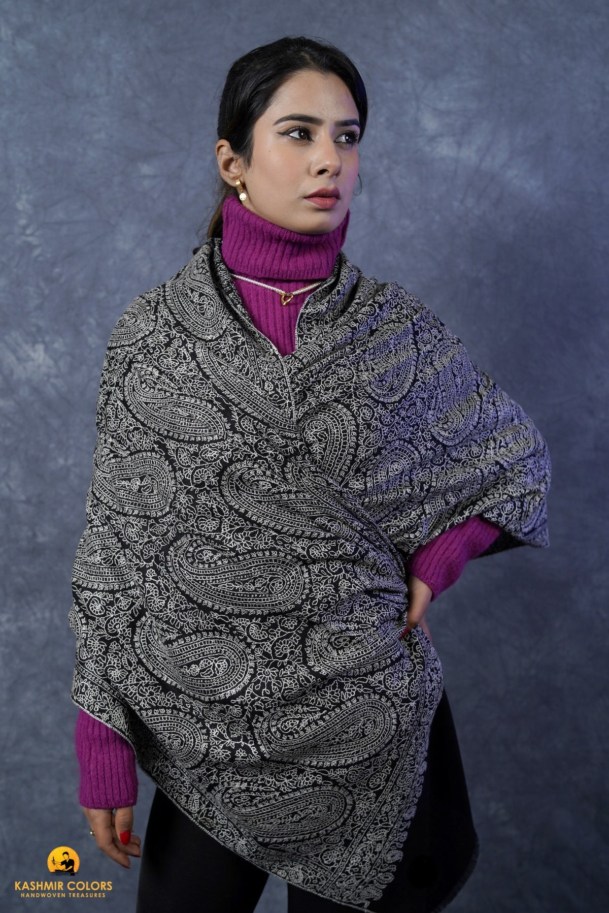 Black Outline Jamavar Hand embroidered Pashmina Stole
