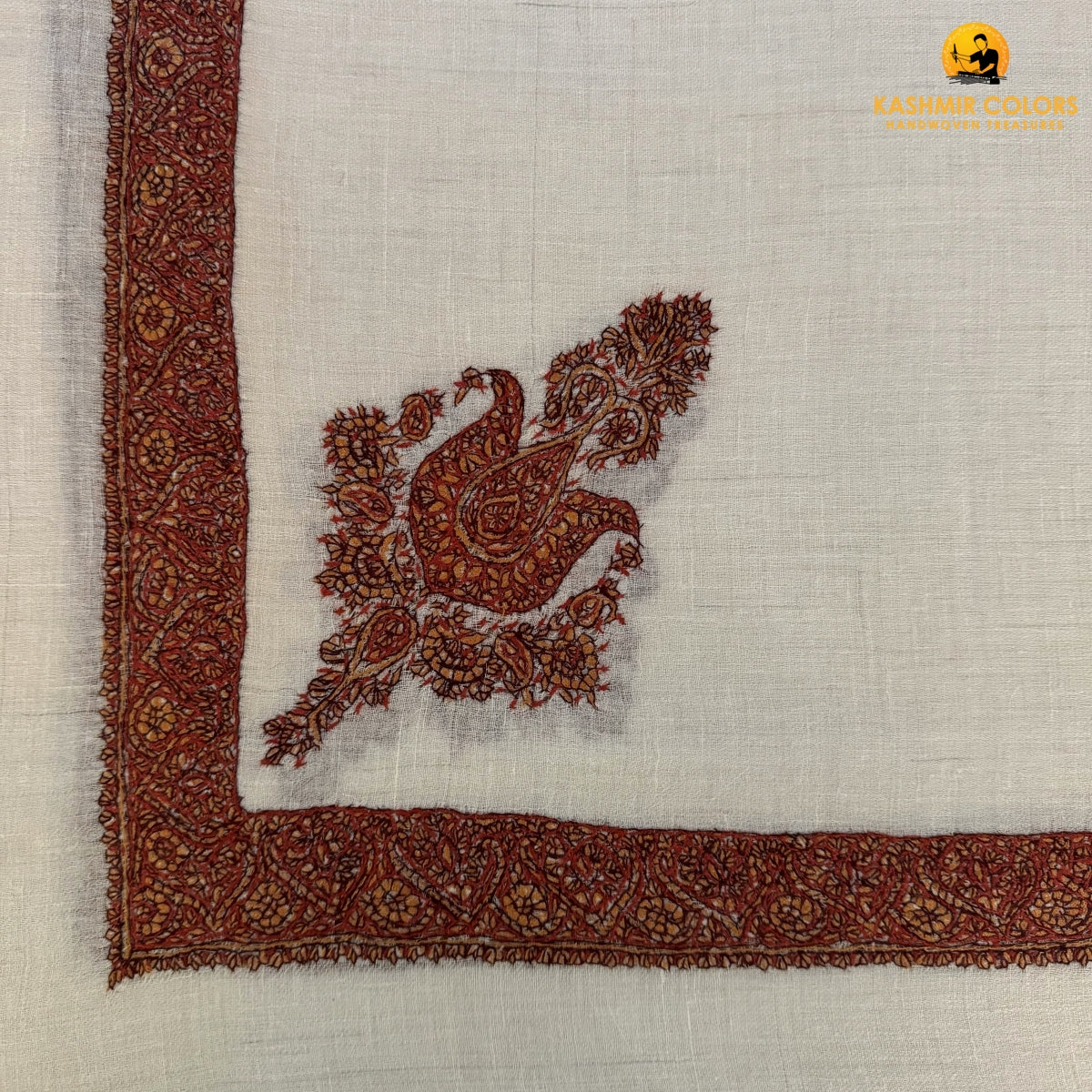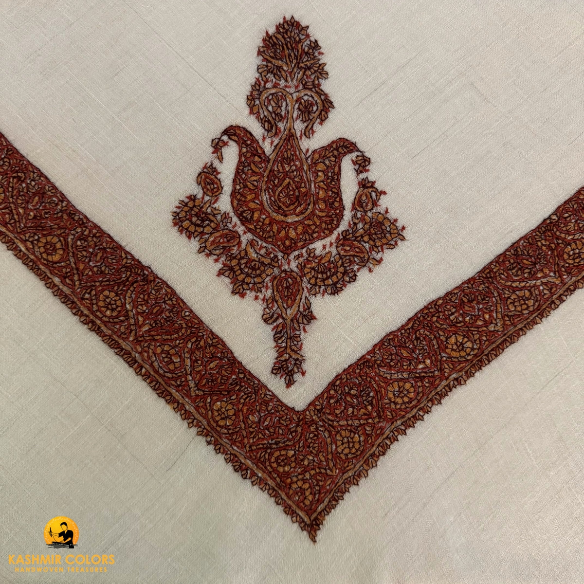 Pure Pashmina White with Browns Hand Embroidered Ghutra Square Scarf
